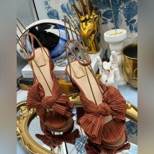 Pleated mid-heel sandal in terracotta organza textile fabric topped with Loeffler Randall's signature knotted bow. Features a padded footbed with gold stamped logo. Open toe with adjustable buckle ankle strap. 2 inch heel.