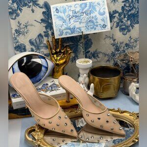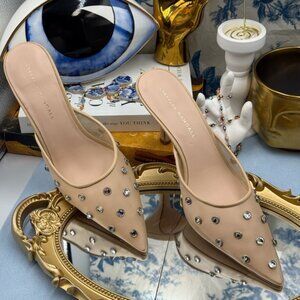 Heeled mule in cream mesh with clear rhinestone embellishments. Features a padded leather footbed with gold stamped logo and a pointed toe.
