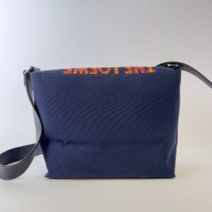 This is an authentic Loewe Canvas Grained Calfskin Printed Street Journal Messenger Bag in Navy. This chic cross body is crafted of navy blue canvas with brown leather trim. The bag has an adjustable shoulder strap and silver hardware. The flap opens up to a spacious fabric interior with a hanging patched pockets.