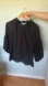 DESCRIPTION: Lightweight Breezy Black Blouse with Standout Bubble Sleeves. Pleated Mock Neck with Button & Loop Closures. Material has a lightly textured stripe.
