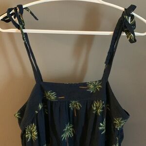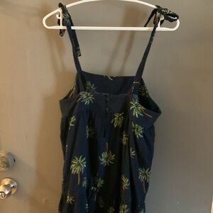 Chic navy dress with a green tropical print. Ideal for beach outings. Ptp 18’ Length 34’