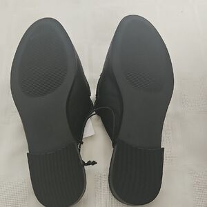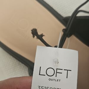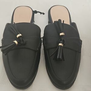 These sophisticated black mules from LOFT feature a sleek open back design and a soft faux leather-like texture. The decorative tassels and metallic hardware add a touch of elegance, making them perfect for both casual and semi-formal occasions.