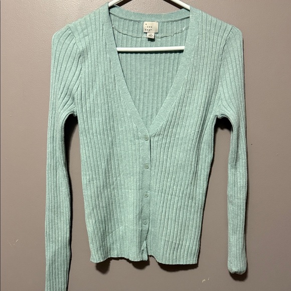 Chic ribbed cardigan in light green. Ideal for layering. Adds elegance to any look.