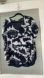 Chic navy and white blouse with abstract floral design. Perfect for versatile styling. A polyester fabric in front and a rayon in back allows for a flowy fit. Please see measurements in pics.