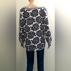 White Long Sleeve Blouse with Grey Paisley Print. Button Cuff. Side Slits