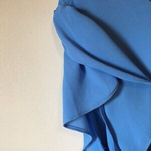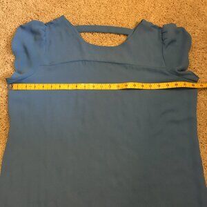 Very good preowned condition periwinkle blue top in a chirimen-crepe-like material, with a slight cap sleeve with flutter by Loft. Features a beautiful cut out in the back with a V-shaped collar. Beautifully designed by a Canadian based company.