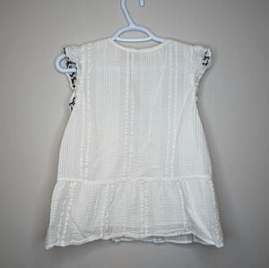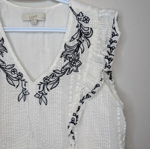 LOFT Petites MP White Sleeveless Blouse Blue Embroidery Ruffled Detail Women