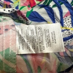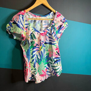 This relaxed blouse from LOFT features a charming ruffled design in a delightful pink and blue color palette. The lightweight fabric and comfortable fit make it an ideal choice for a stylish yet casual look.
