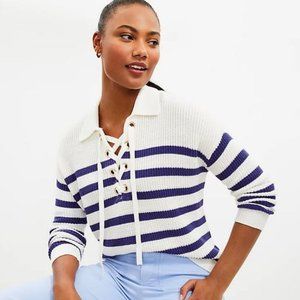 LOFT: Striped Lace Up Polo Sweater - white/blue