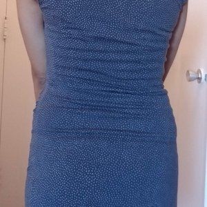 GUC. Blue dress with cream dainty floral like printed shift satin lined dress with some rushing on the right-hand side. Hits me just above the knee.