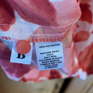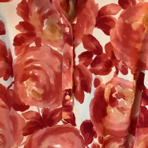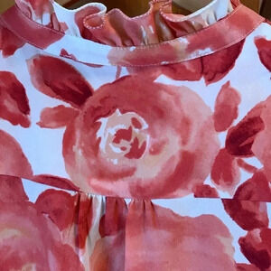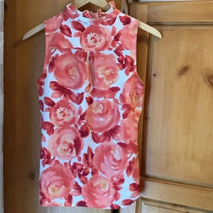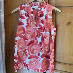 Pretty floral sleeveless tunic-blouse. High neck W ruffle and buttons to mid chest. Fabric covered buttons. Colors of white with orange-coral and pink floral pattern. Size XS. Immaculate.