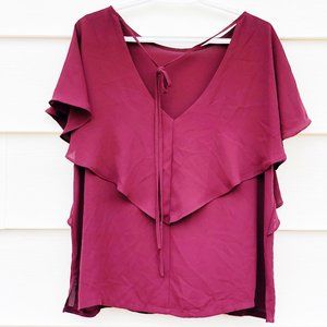 LOFT flowy maroon blouse in size medium. Oversized fit with scoop neck and partial open back that has a tie at the top. Sleeves are half length and flowy with no elastic. Back has a single-tier layer detail that's part of the sleeve.