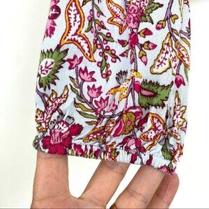 Elasticized at the sleeve cuffs and waist. Cropped and boxy. Floral print on a pale blue background. Very pretty.