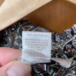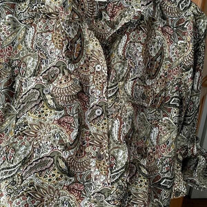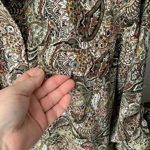 Olive green, brown on white small floral paisley pattern. Long sleeves. Light and flattering silhouette and versatile wear. Size Small.