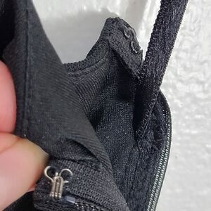 Lovely black dress from Loft by Ann Taylor with a V neck front and gathered knot detail below the bust. Gathered fabric continues around to the lower back. Side zip closure plus hook and eye. Excellent condition, worn once, no stains or tears. US size 2. Dry clean recommended as cleaning method. Fabric content label has been removed sadly but it's a weighty slinky poly blend sort of material.