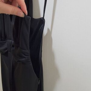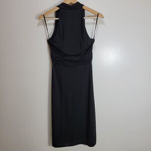 Lovely black dress from Loft by Ann Taylor with a V neck front and gathered knot detail below the bust. Gathered fabric continues around to the lower back. Side zip closure plus hook and eye. Excellent condition, worn once, no stains or tears. US size 2. Dry clean recommended as cleaning method. Fabric content label has been removed sadly but it's a weighty slinky poly blend sort of material.