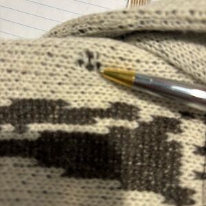 LOGHOUSE Sz M 100% Wool Cardigan Point Lapel Button Closure Pockets Side List Made in Canada. Cozy and warm. Cottage core. Cabin core.