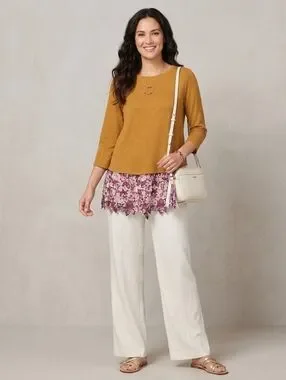 This top is comfy and cute--sure--but the hem has it all, from a pretty pattern to a layered look. From LOGO Lounge by Lori Goldstein.