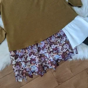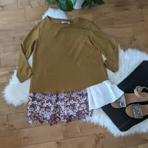 Features: scoop neckline, 3/4-length sleeves, side-seam pockets, contrast color ruffle poplin hem with embroidered asymmetrical overlay