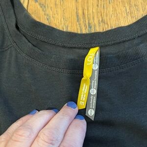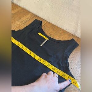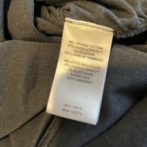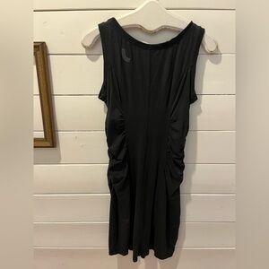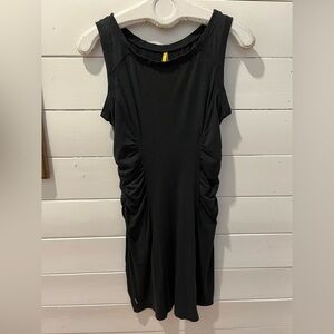 This Lolë dress is a black sleeveless, form-fitting dress with side ruching that adds a feminine and flattering touch. Made from a blend of 48% organic cotton, 47% lyocell (Tencel), and 5% elastane, it offers softness, comfort, and stretch. Perfect for a casual yet elegant look