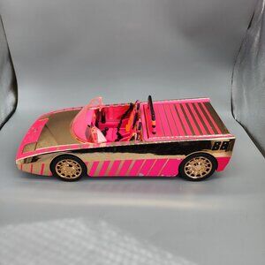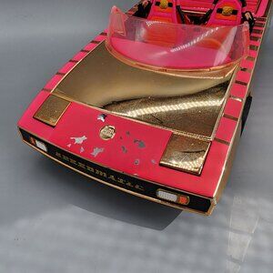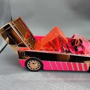 Stylish pink and gold BB vehicle with rotating steering wheel and fold-down backseat that transforms into a pool or dance floor.