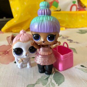 LOL Surprise Doll Glitter Hair Pastel Bun with Pet Dog and Pink Purse Set