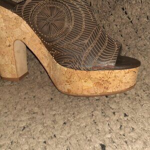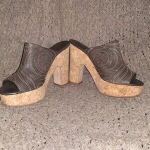 These Lola Cruz Cork Platform Clogs feature a boho-inspired design with embossed leather, mini studs, and an open toe silhouette. The brown leather upper is complemented by a block platform heel, giving a 70s-inspired vibe.