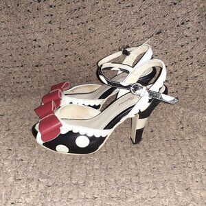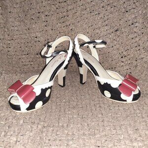 Featuring a black and white polka dot pattern, a red bow accent, and scalloped edges, these sandals are perfect for various occasions such as weddings, parties, and casual outings.