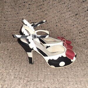 LOLA RAMONA-Angie-Rockabilly/Retro-Black/White Polka Dot-Red Bow-Sz 37-Excellent
