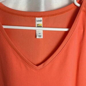Has the Lole L logo on bottom front of tee shirt