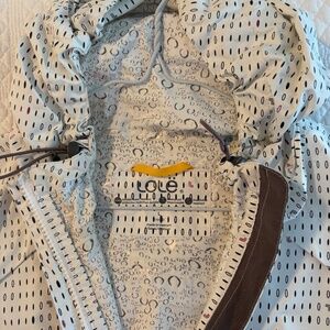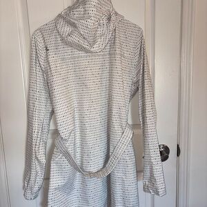 White with Black dots, LOLE raincoat with hood, 2 side zip pockets, optional elasticized belt, and 2 way front zip closure.