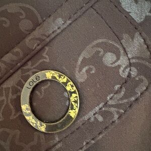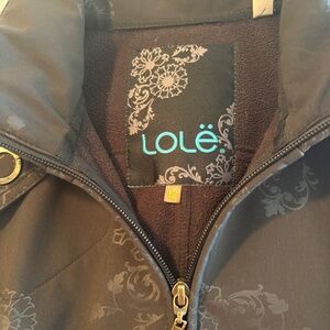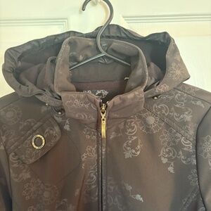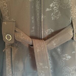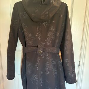 Warm, black (with very subtle pattern) raincoat with detachable hood, black fleece lining, optional belt, gold pulls/details, 2 side zip pockets, and dual front zip closure.