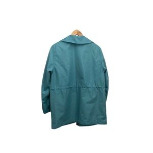 DESCRIPTION: The perfect lightweight Jacket with Classic London Fog Style. Hidden pull cord at waist. Double front pockets. Zip and snap closure. Inner pocket. Adjustable tab wrists. London fog creed inside. Fully lined. Aqua Green with contrasting blue under the collar and zipper flap. *No Hood*