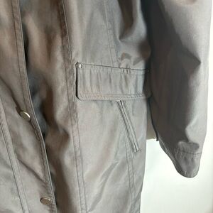 LONDON FOG Sz XL Jacket Coat Snap Zipper Closure Drawstrings Hooded Lined. Back drawstring to cinch the waist. Hood tucks away in the collar. Keep rain away while you are cozy and comfortable. Hint of military yet classic and classy.