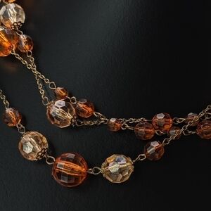 Long Warm Toned Faceted Beaded Chain Necklace with Aurora Borealis Accents. amber and champagne toned beads. an impressive 60" in length, this chain is meant to be looped around the neck for a layered look. no clasp, so number of layers will depend on size of buyers head. reminiscent of Art Deco style. in lovely preloved condition. costume jewelry.