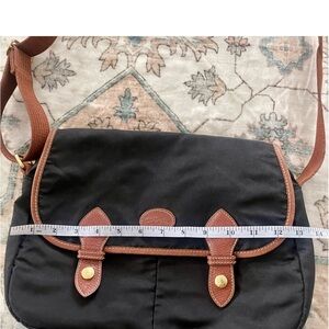 This Longchamp bag is the perfect blend of style and functionality. Longchamp satchel, featuring a sleek black fabric body complemented by rich brown leather accents. Crafted for those who appreciate timeless elegance, this bag is ideal for both casual outings. Its spacious interior ensures you can carry all your essentials with ease. It features a magnetic flap closure, zipper closure, two exterior roomy pockets. Overall it is in great condition, but the interior top has a small rip, this doesn't affect anything in the bag.