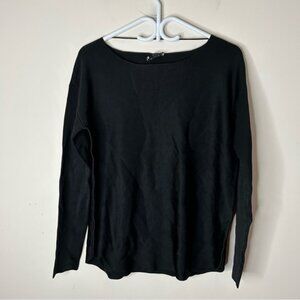 This appears to be a black long-sleeve boat-neck top with small side slits at the hem. It looks similar in style and features to several casual, basic tops