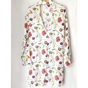 Loose fitted off-white / cream shift dress with high neck, open back and long sleeves. This free flowing design is finished with a stylish autumnal orange, green and purple print.