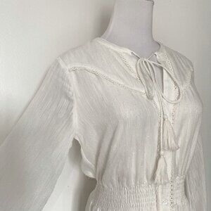 LOST + WANDER WHITE TEXTURED BUTTON FRONT SMOCKED WAIST TASSEL MAXI DRESS - S