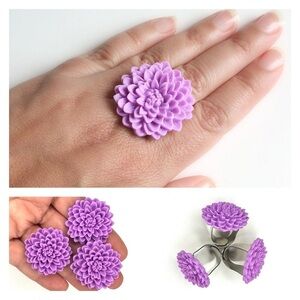 Lot of 3 light purple resin adjustable chrysanthemum flower rings. Flower measures 35mm diameter. Lot sold as is. Also available in 11 different colours. Check my closet for more and collect them all. Bundle to save!