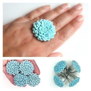 Lot of 4 light blue resin adjustable chrysanthemum flower rings. Flower measures 35mm diameter. Lot sold as is. Also available in 11 different colours. Check my closet for more and collect them all. Bundle to save!