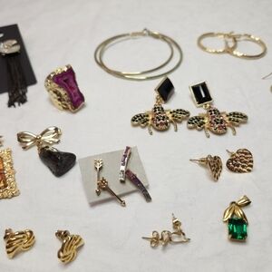 Earrings, hoops, brooches, single green pendant, pink Agate stone ring, hearts, rhinestones, bees, All New Like New Unworn.