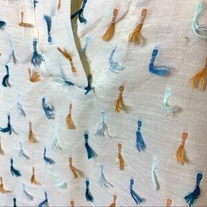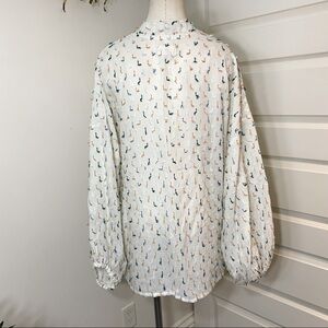 In Mint condition, lightweight flowy semi sheer colorful loose fit blouse, embroidered multicolor loose thread (hard to explain), balloon wide sleeves with elastic wrist hem. Please see pictures