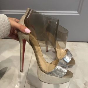 AUTHENTIC TRANSPARENT LOUBOUTIN HEEL SIZE 39 VELVET AND SNAKESKIN MATERIAL. Used but in still pretty good condition. Protector under the shoe to keep from damaging.