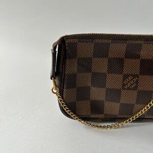 2020 Louis Vuitton Damier Ebene Mini Pochette with Gold Chain. Chain link strap and top zip closure. Date code: SF4290