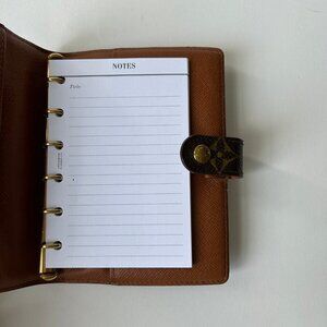 Louis Vuitton Small Ring Monogram Agenda. This compact agenda cover in Monogram canvas can hold three credit cards. It can be used as an address book, notepad, or calendar. Features press stud closure, six-ring binder, three credit card slots Agenda, address book or notepad refills available separately (comes with a notepad refill)