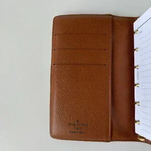 Louis Vuitton Small Ring Monogram Agenda. This compact agenda cover in Monogram canvas can hold three credit cards. It can be used as an address book, notepad, or calendar. Features press stud closure, six-ring binder, three credit card slots Agenda, address book or notepad refills available separately (comes with a notepad refill)