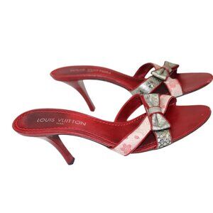 Step out in luxury with these stunning Louis Vuitton monogram satin cherry blossom open toe red heeled sandals. These kitten heels slides are crafted in soft red leather lined uppers. They feature the iconic Monogram Cherry design on satin fabric with silver metallic python trim and bow detail. The soles are padded with soft red Alcantara.
