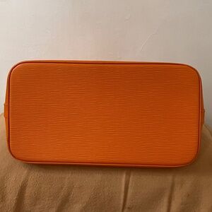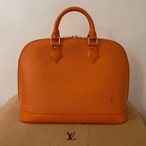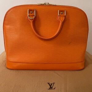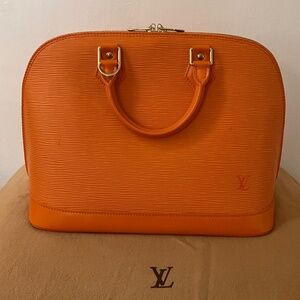 Vintage from 2004, Mandarin Epi Leather Alma top handle bag, brass hardware, rolled handles, cowhide leather and manmade interior lining, interior pocket and cell phone pocket, zip closure at top, inside and bottom are perfect condition, there are 4 faint marks, 2 on the front, one at the back and one on handle (see photos) handle drop is 3.25”, height 9.5”, width 12.25”, depth 6.5” Made in France 🇫🇷