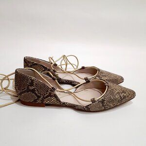 Romantic ankle wrap flats, great for a summer coffee date. Leather with metallic snakeskin pattern in gold tan & brown. Ankle strap in gold tone leather with gold hardware on the ends.
